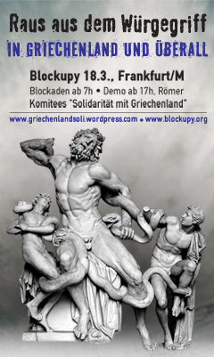 Aus allen diesen Gründen rufen wir zu einer starken internationalen Beteiligung an den Aktionen am 18. März 2015 in Frankfurt auf. Es wird nicht nur eine ungehorsame Massenaktion am Tag der EZB-Eröffnung geben, sondern eine Vielzahl von Demonstrationen, Blockaden und anderen Aktionen darum herum. Die großen Blockupy Aktionen 2012 und 2013 waren nur der Anfang. Der Protest und der Widerstand werden nach Frankfurt zurückkehren – stärker in der Zahl und in der Entschlossenheit als zuvor!