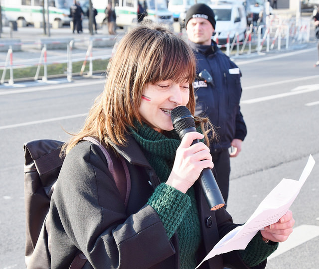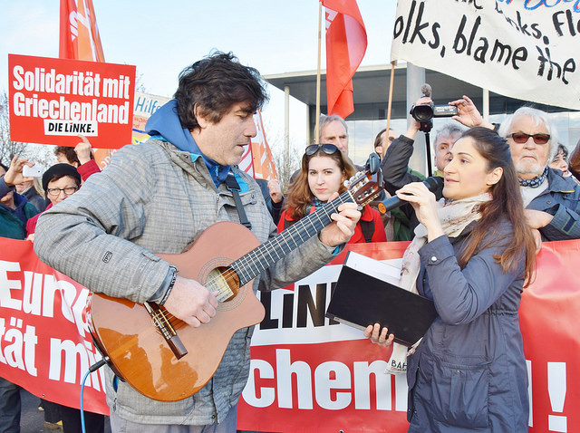 Elina Skarpathioti (Griechenland) und Ruben Maximo Farrah (Argentinien, beide Foto oben) und eine weitere Musikgruppe sorgten für musikalische Ermunterung. Katja Kipping, Annette Groth (beide Partei Die Linke), Mariangeles Sanchez (Podemos), Kostas Papanastasiu (beide siehe Foto unten) und Georg Brzoska (beide Bündnis Griechenlandsolidarität Berlin) hielten Reden.
