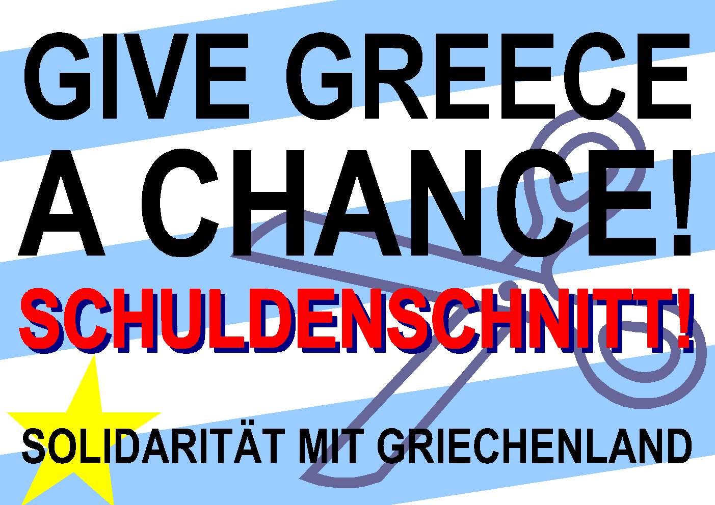 Give Greece a Chance! Ist ein Schuldenschnitt für Griechenland so viel verlangt, wenn man soeben hört, dass der Ukraine Milliarden Euro an Schulden erlassen wurden? Es ist Zeit, den unfähigen Politikern in Brüssel zu sagen, wo der Ausgang ist.