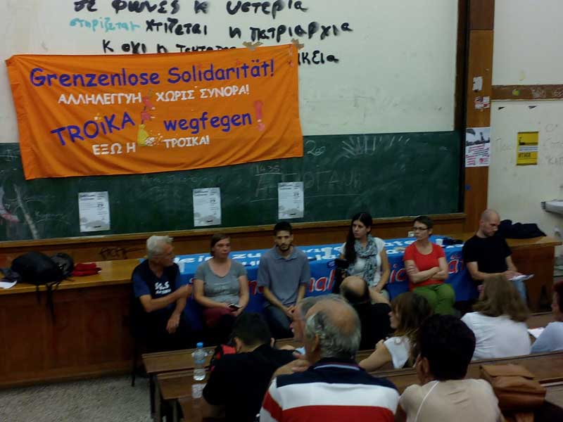 Spendet bitte für die von der Krise betroffenen Menschen, die sich gegen die Troikapolitik zusammen geschlossen haben und für einander einstehen. Zeigt Ihnen, dass aus Merkels und Schäubles Deutschland Solidarität von unten und praktische Unterstützung kommen!