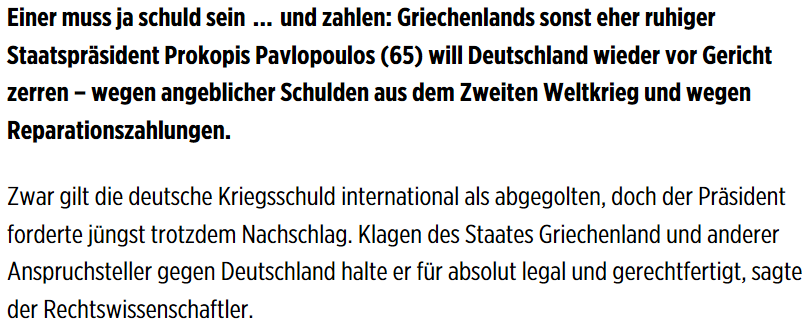 Vielleicht ist der Artikel in der Bild vom 14.12.2015 eine Reaktion auf die klare Botschaft des griechischen Staatspräsidenten vom Vortag, dass Reparationsforderungen moralisch und juristisch gerechtfertigt seien (siehe hier).