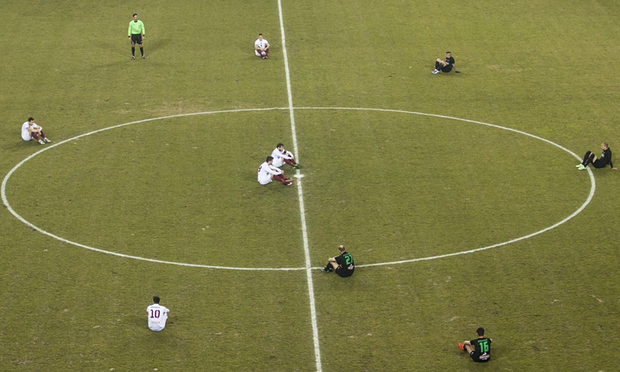 Alle Spieler des Fußballspiels zwischen Larissa and Acharnaikos setzten sich am 29.1.2016 nach dem Anpfiff auf den Boden, um gegen die Flüchtlingspolitik der EU zu protestieren.