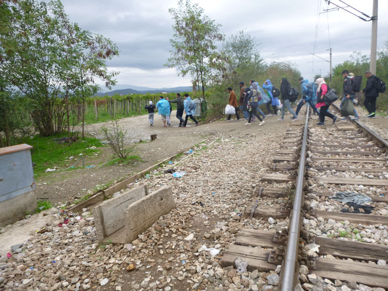 Bereits auf der Autobahn, kurz vor der letzten Abfahrt vor Mazedonien, fallen viele Menschen auf, die mit schweren Gepäck zu Fuß unterwegs sind. Ihr Ziel ist ein Gelände bei dem kleinen Ort Idomeni. Um ein Refugeecamp herum haben Geflüchtete aus Platzmangel provisorisch hunderte Zelte aufgebaut – es ist laut, dreckig, chaotisch. Bei Regen versinkt das Gelände im Schlamm. Überall laufen Kinder herum, schlafen Menschen im Freien oder selbst gebauten Unterkünften. Rund um die Uhr kommen weitere Menschen im Minutentakt hinzu.“