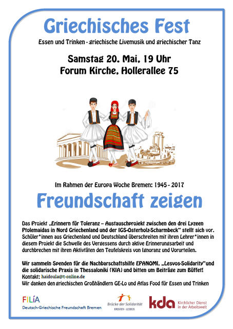 Das Projekt „Erinnern für Toleranz – Austauschprojekt zwischen den drei Lyzeen Ptolemaidas in Nord Griechenland und der IGS-Osterholz-Scharmbeck“ stellt sich vor. Schüler*innen aus Griechenland und Deutschland überschreiten mit ihren Lehrer*innen in diesem Projekt die Schwelle des Vergessens durch aktive Erinnerungsarbeit und druchbrechen mit ihren Aktivitäten den Teufelskreis von Ignoranz und Vorurteilen.