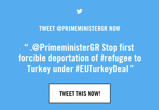 „Amnesty International ruft zur Verhinderung der Abschiebung in Griechenland befindlicher Asylbewerber und Flüchtlinge in die Türkei auf, da diese kein sicheres Drittland sei.