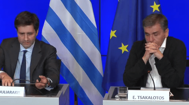 Die beiden Vertreter der griechischen Regierung nach dem Treffen der Eurogruppe