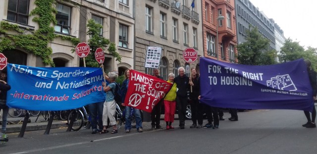 Menschen vor der griechischen Botschaft gegen die drohende Räumung von