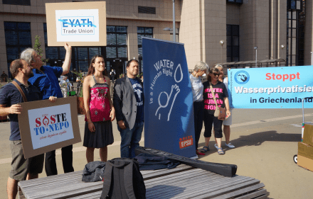 [Auf dem Bild (v.l.n.r.): Yiorgos Vassalos (Brüsseler Solidaritätsgruppe für Griechenland); Andrej Hunko (MdB – Die Linke); Frida Kieninger (Food & Water Europe); Pablo Sanchez Centellas (European Public Service Union); Imke Meyer (Netzwerk Griechenlandsolidarität; Noreen Murphy (European Water Movement)]