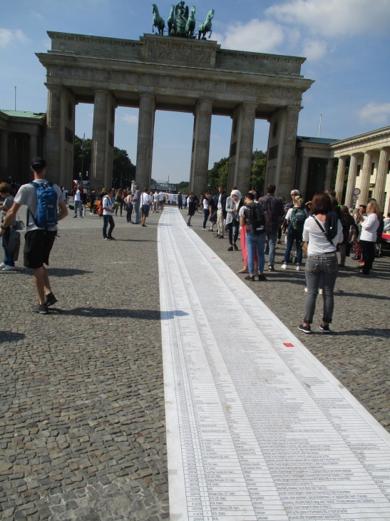 Vor dem Brandenburger Tor wurde ein 100 Meter langes Banner mit den Namen von mehr als 17 000 Flüchtlingen ausgerollt. Es waren darauf nur die Namen derer gelistet, die bis 2012 auf der Flucht nach Europa ums Leben kamen. In den letzten 5 Jahren hat sich diese Zahl noch einmal verdoppelt.