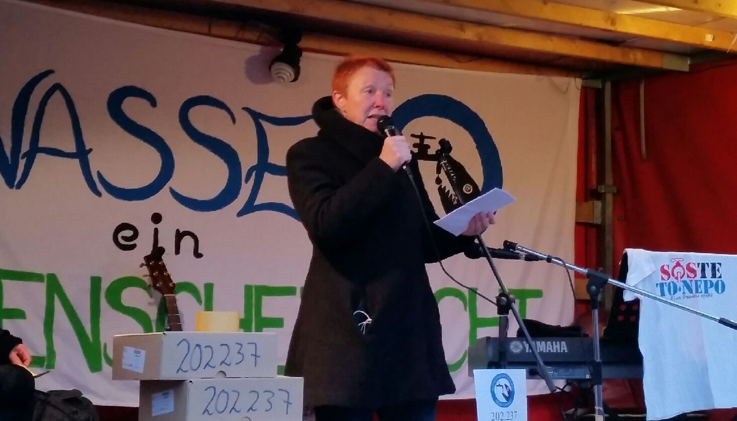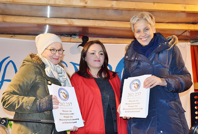 Auch Christa Hecht, die Geschäftsführerin der Allianz der öffentlichen Wasserwirtschaft, hielt eine engagierte Rede gegen die Wasserprivatisierung in Griechenland und für die Solidarität mit dem Widerstand.