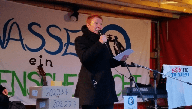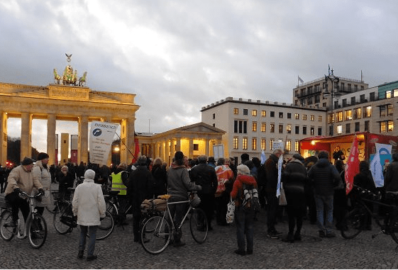 Das war die Forderung am 13.11.17 vor dem Brandenburger Tor. Die Petition ist an die EU und an den (ehemaligen) Finanzminister Wolfgang Schäuble gerichtet. Schäuble (noch als Finanzminister) weigerte sich, die Unterschriften entgegenzunehmen. Deshalb haben wir uns an Bundestagsabgeordnete gewandt, um ihnen die Unterschriften zu übergeben. 202.000 Unterschriften wurden an die Bundestagsabgeordnete Sevim Dağdelen übergeben, die versprach, die Botschaft an den Bundestag weiterzugeben. Mittlerweile haben bereits weit mehr als 205.000 Menschen die Petition unterzeichnet.