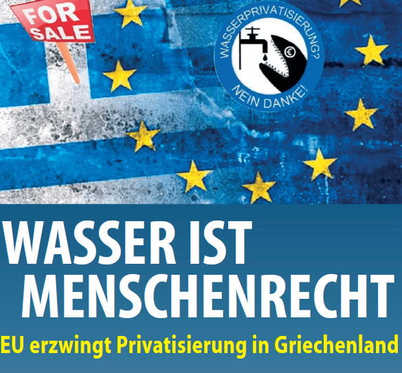 Aber versuchen wir die Fäden der „Privatisierung der griechischen Wasserversorgung“ etwas zu entwirren. Die Entwicklungen dürften aus den Solidaritäts-Aktionen gegen die Wasserprivatisierung hinlänglich bekannt sein: Die ursprünglich öffentlichen Wasserwerke von Athen und Thessaloniki sollten verkauft / privatisiert werden. Der Widerstand dagegen mündete in eine Volksabstimmung, in der sich 2014 in Thessaloniki 98% der Teilnehmer gegen eine Privatisierung aussprachen. Den vorläufigen Endpunkt setzte eine Entscheidung des obersten griechischen Verwaltungsgerichts, wonach eine Mehrheit der Unternehmen in öffentlicher Hand verbleiben müsse. SYRIZA erklärte, dieser Entscheidung folgen zu wollen.