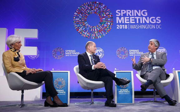 Lagarde, Chefin des IWF, Finanzminister Scholz und der Chef der Eurogruppe, Centeno auf der Frühjahrstagung des IWF