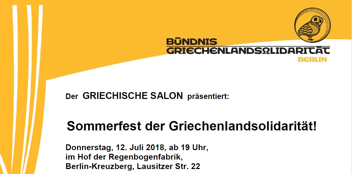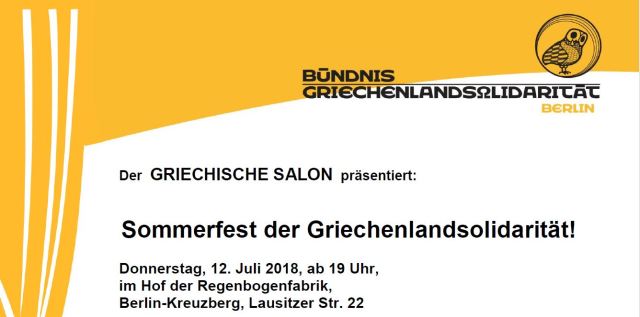 Wir möchten alle Berliner Griechenland-Soli-Gruppen und Griechenland-Interessierte zu einem Sommerfest (mit Grillgut und Häppchen!) einladen. Wir wollen feiern und uns austauschen über die vergangenen und aktuellen Entwicklungen, über unsere Aktivitäten und über Pläne für die Zukunft. Und wir wollen nach immer neuen Möglichkeiten der Zusammenarbeit suchen. Zwanglos, aber nicht planlos.