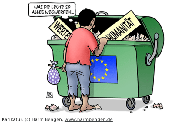 „Auf dem EU-Gipfel wurden drastische Maßnahmen vereinbart: Flüchtlinge sollen innerhalb Europas in geschlossene Lager gesperrt werden, im Mittelmeer Gerettete will man auf nicht näher definierten »Ausschiffungsplattformen« abladen und die dubiosen Milizen der sogenannten »libyschen Küstenwache« bekommen noch mehr Geld.“