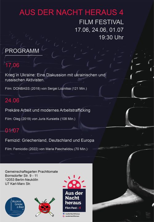 Das Filmfestival „Aus der Nacht Heraus“ wird zum vierten Mal organisiert. Durch Filmvorführungen und Paneldiskussionen setzen wir uns mit aktuellen sozialpolitischen Themen auseinander. Unser erstes Festival befasste sich mit dem Aufstieg des Rechtsextremismus und das zweite mit den Schwierigkeiten der neuangekommenen Migrant*innen (prekäre Arbeit, Wohnungssuche/Gentrifizierung, psychische Auswirkungen der Migration). Das dritte Festival hat sich mit der Sexualität, der Solidarität sowie der Integration in einer multikulturellen Gesellschaft beschäftigt.