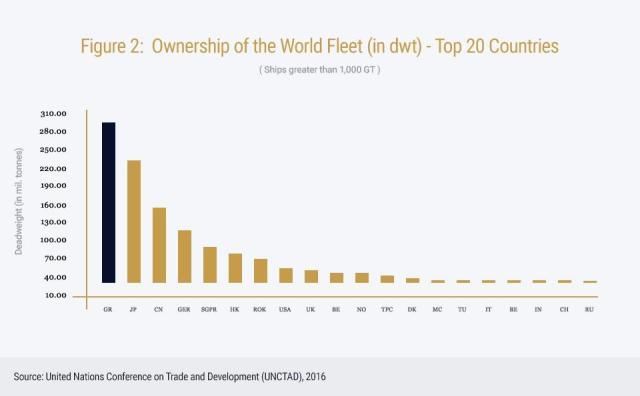 Kefalogianis wusste, wovon er sprach. Schon in den achtziger und neunziger Jahren waren die griechischen Schiffstycoons zu den mächtigsten der Welt aufgestiegen. Sie sind es bis heute geblieben. Dies wurde erst Anfang Juni 2018 wieder bei der internationalen Schifffahrtsausstellung „Posidonia“, die alle zwei Jahre in Athen stattfindet, demonstriert. „Wir konnten unsere führende Position sogar ausbauen“, verkündete stolz der Präsident der Marinekammer Griechenlands, Jorgos Pateras. Demnach befinden sich aktuell in den Händen der griechischen Reeder 4.727 Handelsschiffe, gefolgt von den Reedern aus China und Japan. Noch überlegener ist deren Position, wenn man die Stärke der Flotte (Stand: 2016) nach Tragfähigkeit in dwt (deadweight tonnage) misst (siehe Grafik).