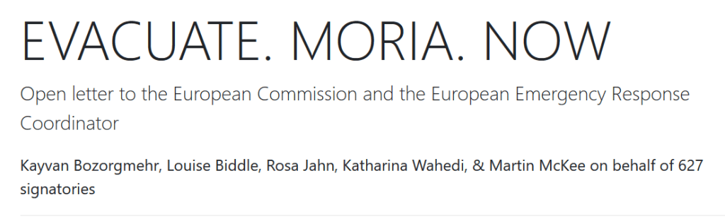 Now, more than ever, is the time for evacuating Moria and other camps on the Greek islands, where human rights, humanitarian principles, health security and pandemic control measures converge in unprecedented urgency. As public health professionals and scientists concerned with migration, public health, humanitarian aid, and infectious disease control, we call upon the European Commission and the European Emergency Response Coordinator to take urgent action to mobilise all required resources to evacuate Moria and the camps in Chios, Kos, Leros, and Samos. This is a public health imperative.