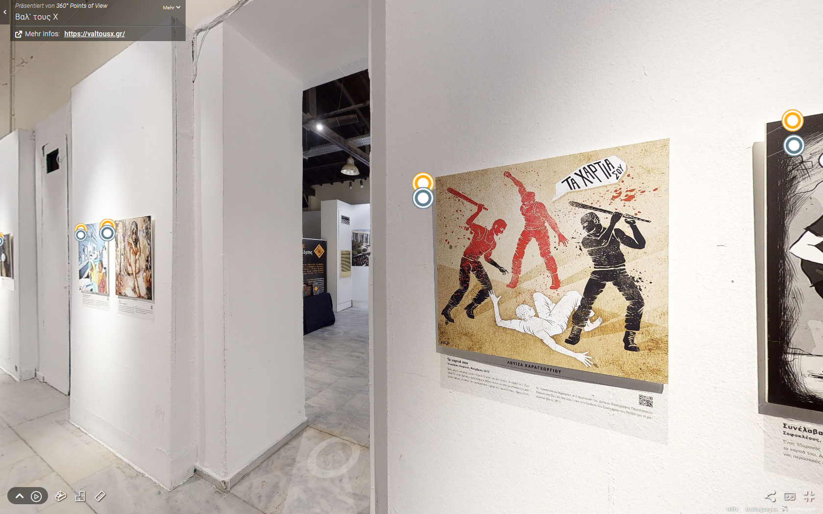 „In einer virtuellen 3D-Tour zeigt die Ausstellung „X them out – Die schwarze Karte rassistischer Gewalt“ Angriffe mit rassistischem Hintergrund, die in Kunstwerken festgehalten wurden. Die Arbeiten von verschiedenen Künstlern, die während des Gerichtsprozesses gegen die neonazistische Chryssi Avgi (Goldene Morgenröte) entstanden und von der Geschichte rassistischer Gewalt in Griechenland inspiriert sind, illustrieren Ereignisse, die sich in unserer Stadt, in unserer Nachbarschaft und vor unserer Haustür ereignet haben.