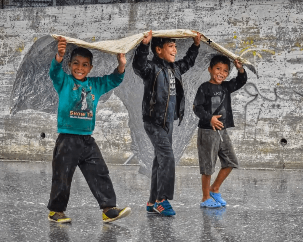 „Das war im alten Camp. Drei Kinder, die eine Plane halten. Sie spielen damit, laufen