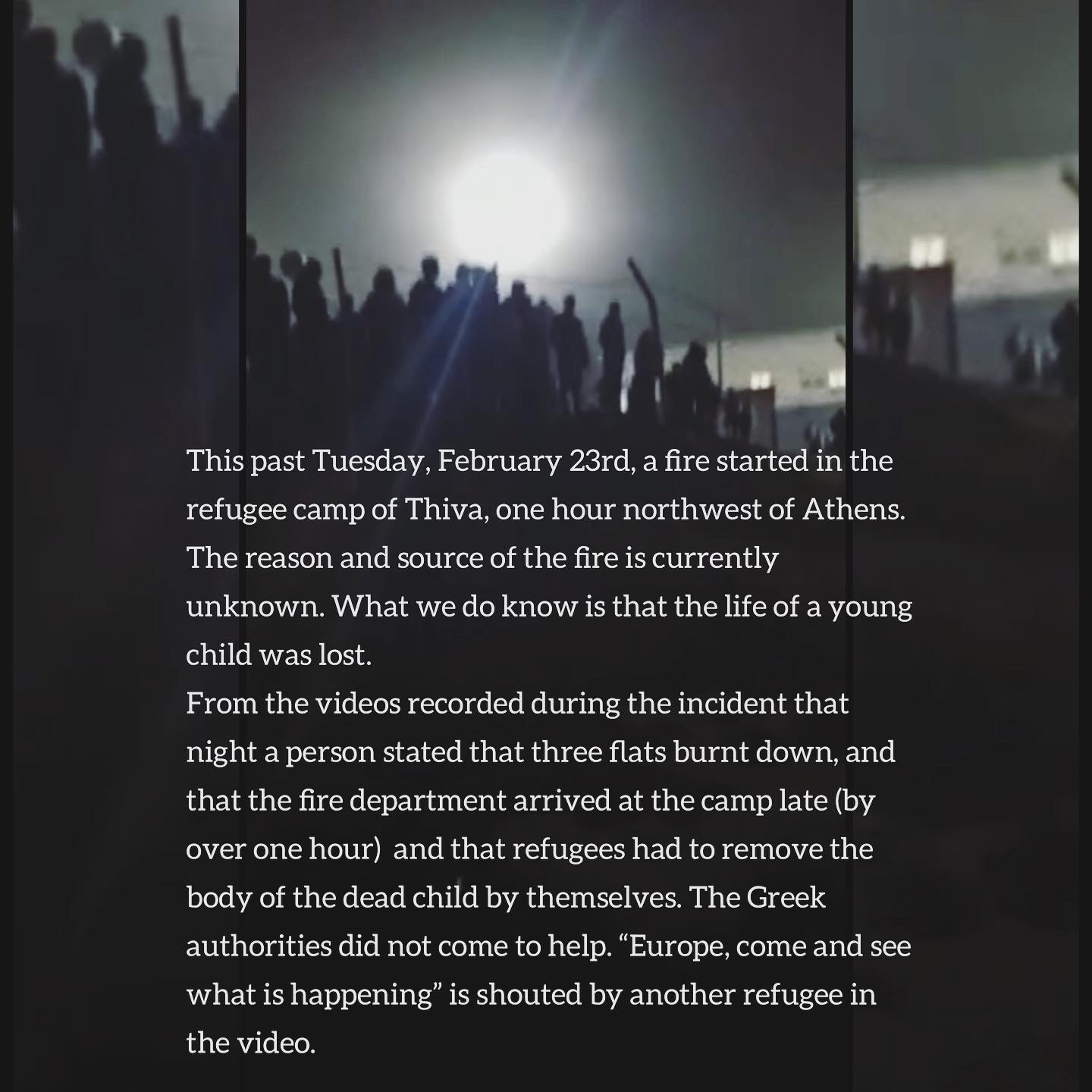 „Am vergangenen Dienstag, dem 23. Februar, brach im Flüchtlingslager von Theben, eine Stunde nordwestlich von Athen, ein Feuer aus.