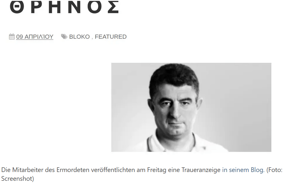 „Trauer – Giorgos Karaivaz, der Gründer und Inhaber von bloko.gr, ist nicht mehr unter uns. Einige haben beschlossen, ihn mit Kugeln zum Schweigen zu bringen, damit er aufhört, seine Texte zu schreiben.