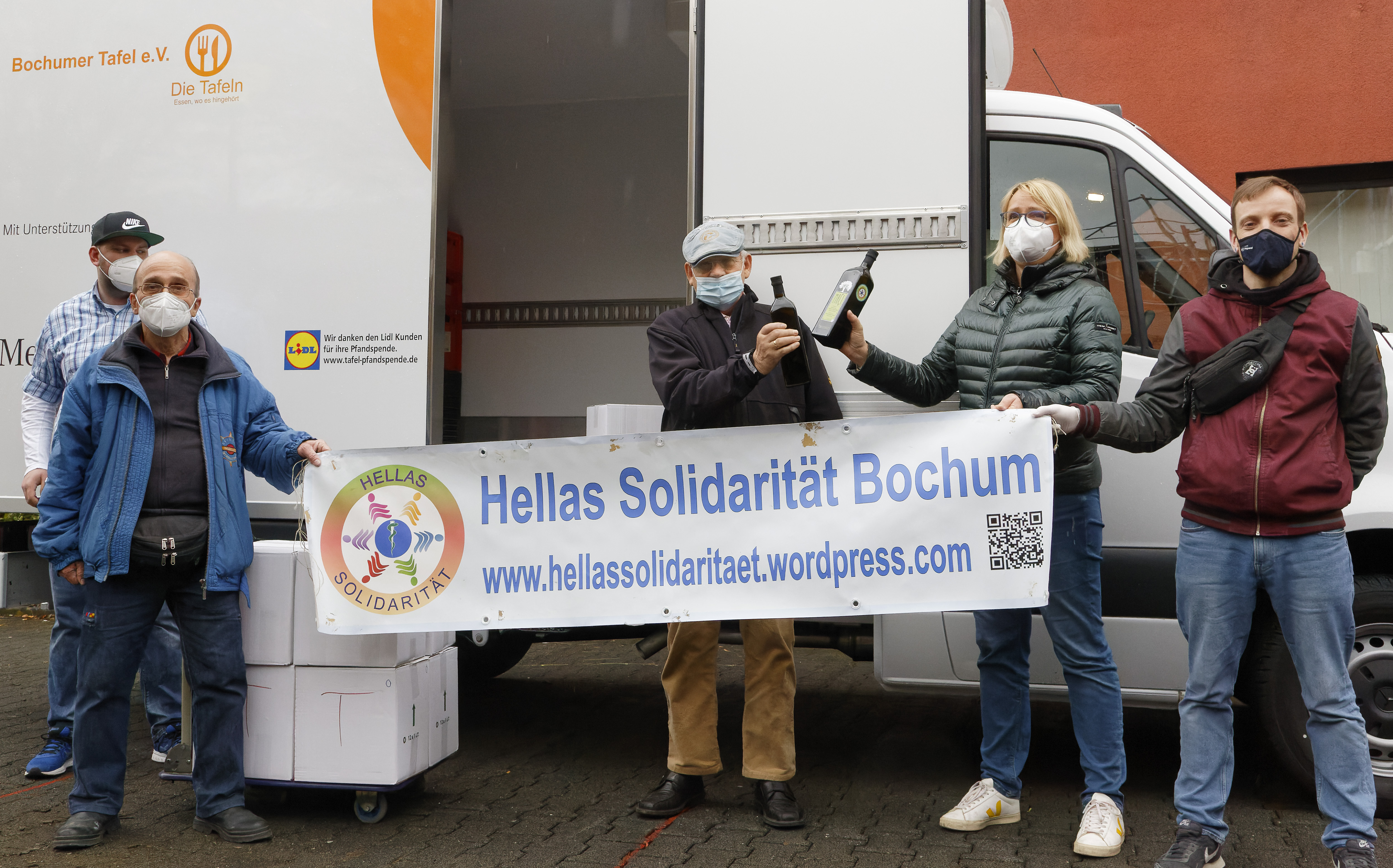 Erstmalig in 2021 rief die Bochumer Hellas-Initiative zu Spenden für die Bochumer und Wattenscheider Tafel e. V. auf. Es kamen rund 200 Liter Olivenöl für die Bochumer Tafel e. V. zusammen. Der Vorsitzende Manfred Baasner und der Mitarbeiter Niklas Fantasia holten die Kartons am Sonntag Abend ab und erklärten, dass das Olivenöl hauptsächlich an die rund 120 bedürftigen Senior*innen gehen wird, die von der Tafel regelmäßig beliefert werden und sich ein Olivenöl dieser Qualität nicht leisten könnten. Sie bedankten sich bei den Bochumer*innen, die das wertvolle Olivenöl gespendet haben.