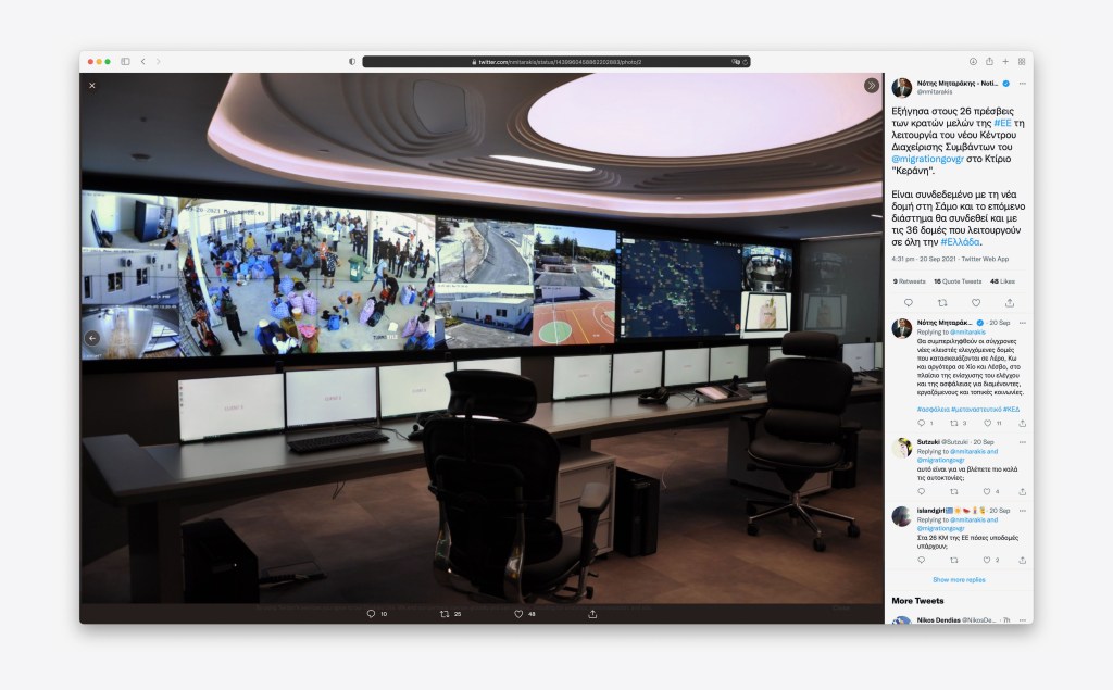 „Kameras übertragen live in die Kommandozentrale der Lager, aber auch in einen dafür eigens eingerichteten Überwachungsraum im griechischen Migrationsministerium. Aus der Kommandozentrale lässt sich bis in die Betten der Menschen sehen. Die Kameras sind teilweise mit künstlicher Intelligenz ausgestattet, die Bewegungen analysiert und Alarm schlägt, wenn sich Menschen beispielsweise in einer Gruppe versammeln. Ebenso werden Gesichter gescannt. Es gibt Wärmebildkameras und auch Drohnen kommen zum Einsatz.