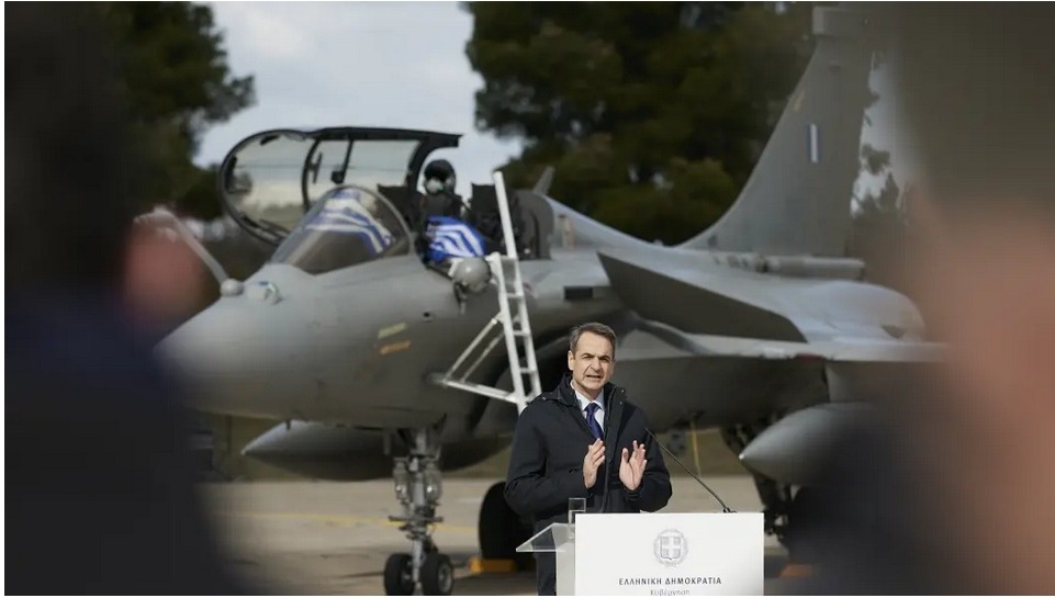 In Tanagra wartete ein Empfangskomitee mit Premierminister Kyriakos Mitsotakis an der Spitze, weiteren Regierungsvertretern, dem französischen Botschafter, der Führung der Luftwaffe und einer Ehrengarde.