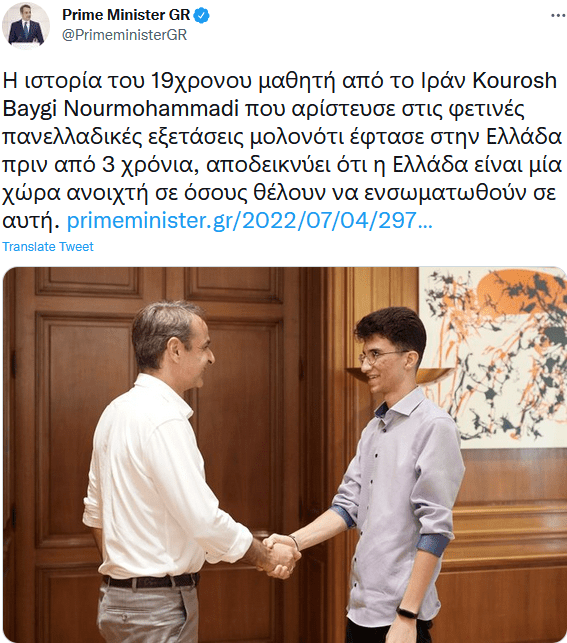 [Übersetzung des Kommentars von Mitsotakis: „Die Geschichte von Kourosh Baygi Nourmohammadi, einem 19-jährigen Schüler aus dem Iran, die die diesjährigen Panhellenischen Prüfungen mit Bravour bestanden hat, obwohl er vor drei Jahren nach Griechenland kam, beweist, dass Griechenland ein Land ist, das offen ist für alle, die sich integrieren wollen.“]
