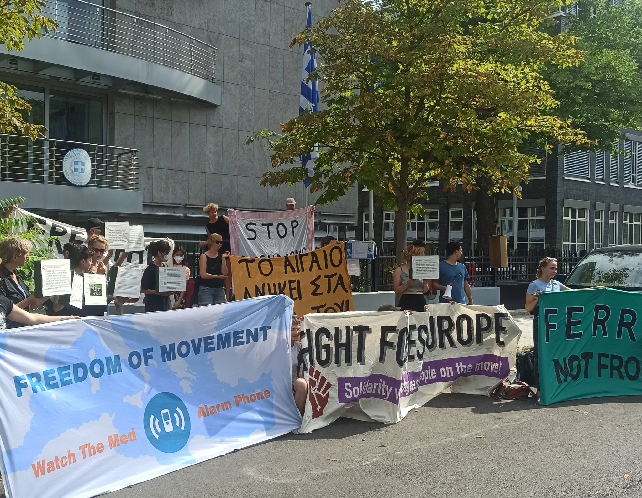 Heute, am 18.8.2022. haben No Border Assembly Berlin. Mare Liberum, Alarm Phone und Borderline Europe vor der griechischen Botschaft ein Ende der systematischen Pushbacks durch Griechenland und Frontex gefordert.