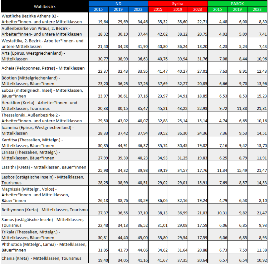 Im Zeitraum 2010-2015 war ein weiterer potenzieller sozialer Machtblock, dessen politischer Vertreter SYRIZA war, im Entstehen: der soziale Block der Arbeiter*innenklasse und ihrer potentiellen oder zeitweiligen Bündnispartner. Ab dem Zeitpunkt der Umwandlung des Referendum-Ergebnisses von Nein in Ja im Juli 2015, mit den Zwischenstationen des dritten Memorandums und der Memoranden-Regierung 2015-2019, sowie der Art der Opposition, die Syriza im Zeitraum 2019 bis heute ausübte, wurde dieser Block jedoch geschwächt und löste sich schließlich bei den Wahlen 2023 auf… Die Hinwendung von Syriza zur politischen Mitte und zur Mittelschicht wirkte als Abwendungs- und „Entfremdungs“-Mechanismus für all diese Menschen [der Unterschichten]; er zersplitterte sie und brachte sie zu widersprüchlichen politischen Orientierungen.