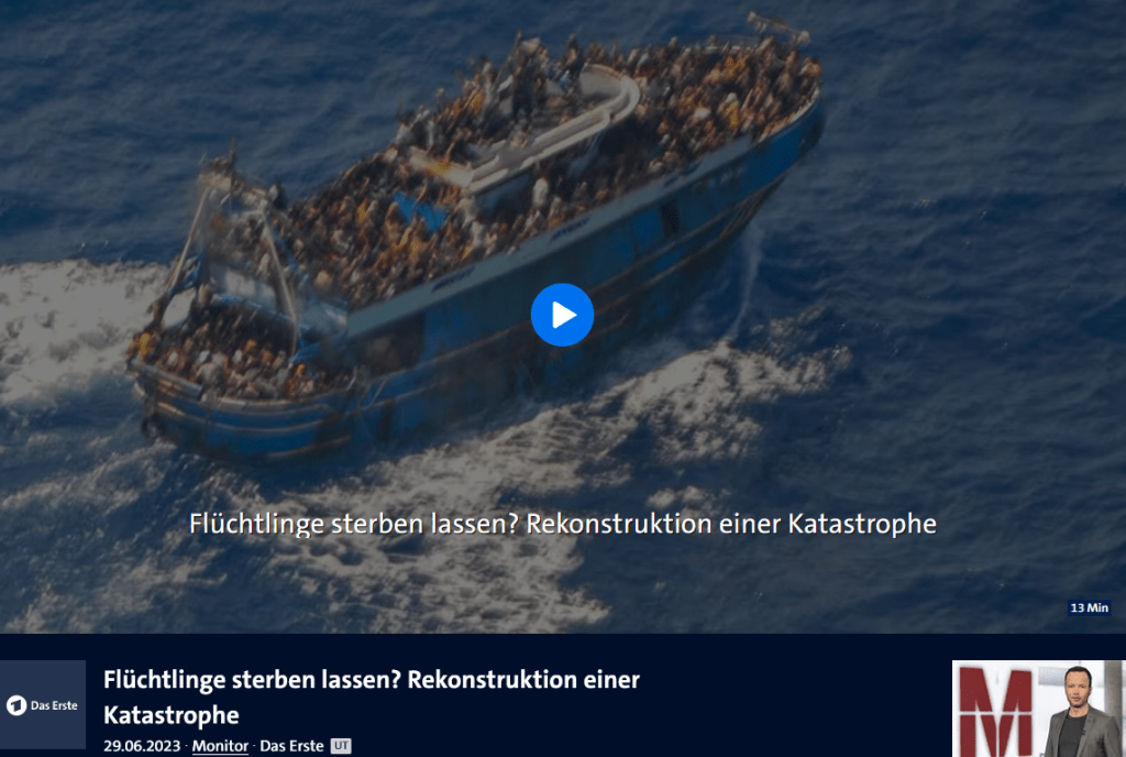 Der Spiegel, El País, Monitor, The Times, SIRAJ, Reporters United und Lighthouse Reports haben über den Schiffbruch vom 14.Juni gemeinsam recherchiert und analysiert. Offensichtlich hat die griechische Küstenwache unter den Augen von Frontex zunächst 15 Stunden nicht gerettet, obwohl sie es gemusst hätte, dann das Schiff willentlich versenkt und zuletzt lange gewartet, bevor sie überhaupt einige Schiffbrüchige gerettet hat. Dazu das Video von Monitor vom 30.6.2023, Bericht von Lighthouse Reports (auf englisch), noch ausführlicherer Bericht von Reporters United (auf griechisch)