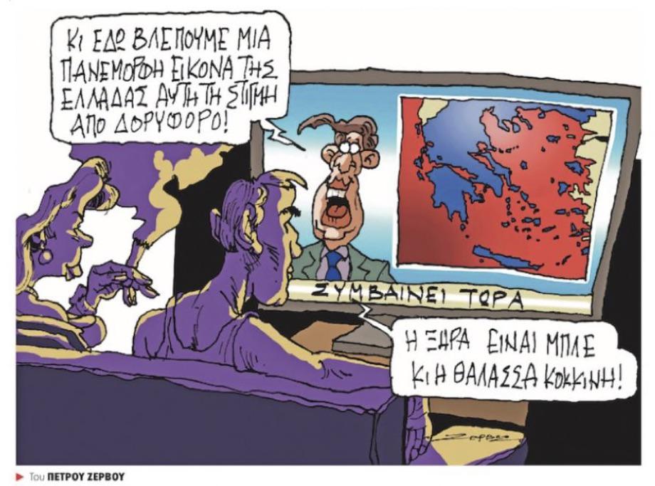 [Sprechblase links:] Und hier sehen wir ein wunderbares Satellitenbild von Griechenland in diesem Augenblick. [auf dem Bildschirm unten:] das aktuelle Geschehen