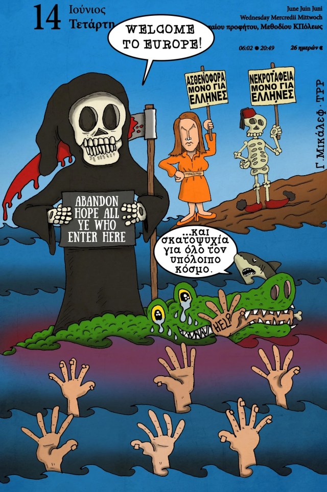 [Schild des Gerippes:] „Friedhöfe nur für Griechen“