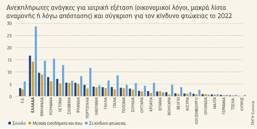 Der obigen Tabelle des Europäischen Statistischen Amtes (Eurostat) über den Zugang zu medizinischen Untersuchungen ist zu entnehmen, dass auf EU-Ebene 3,3 % der Menschen nicht in der Lage waren, sich den notwendigen medizinischen Untersuchungen zu unterziehen, während die Quote in Griechenland mit 16,7 % bei weitem am höchsten war.