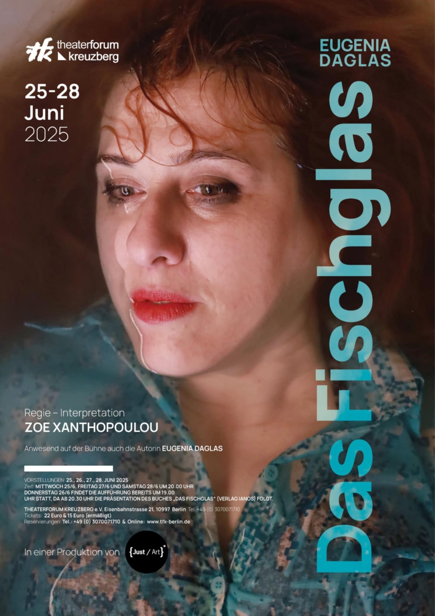 Die mutige, vielseitige Performance-Künstlerin Zoe Xanthopoulou inszeniert den mitreißenden Theatermonolog von Eugenia Daglas, die ihre Feder ganz im Stile des poetischen Realismus führt, und verkörpert dessen Heldin. In einer Produktion des project {Just/art}* gastiert Das Fischglas für lediglich vier Vorstellungen auf der Bühne des Theaterforums Κreuzberg e.V. in Berlin. Premiere ist am 25. Juni 2025. Die Aufführung findet in der griechischen Originalsprache mit deutschen Übertiteln statt.