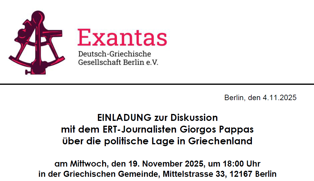 Die Diskussion findet am Mittwoch, den 19. November 2025, um 18:00 Uhr in der Griechischen Gemeinde, Mittelstrasse 33, 12167 Berlin statt