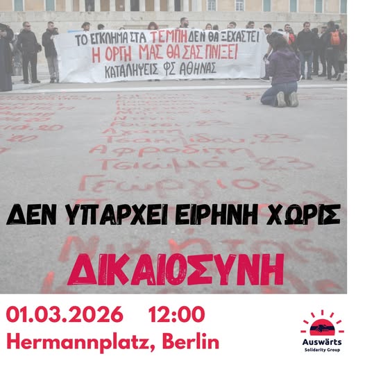 On Sunday, March 1, at 12:00, the solidarity group auswärts – εκτός έδρας calls for a protest at Hermannplatz, in memory of the victims and against the cover-up of the crime in Tempi.