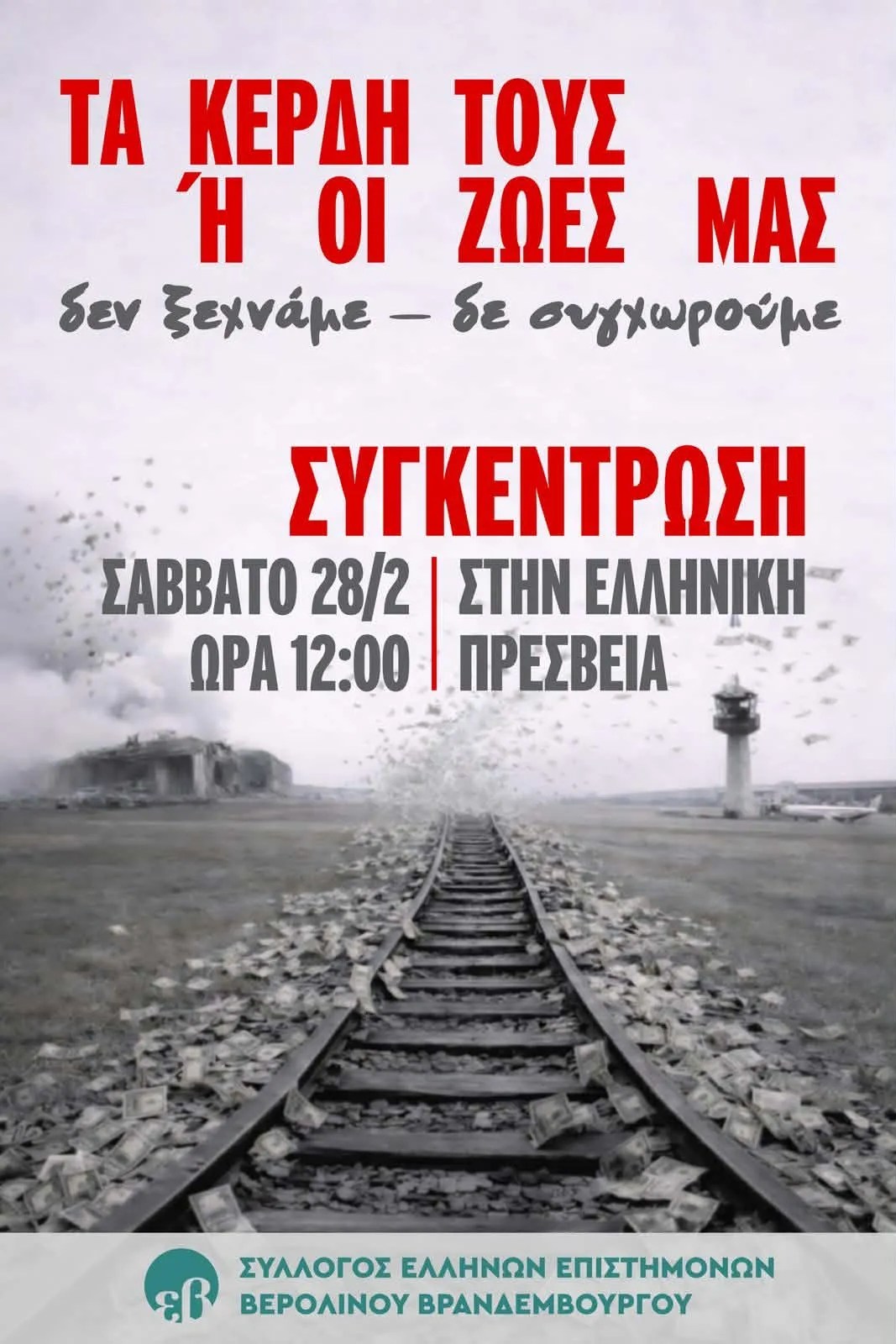 Ο Σύλλογος Ελλήνων Επιστημόνων Βερολίνου Βρανδεμβούργου καλεί σε κινητοποίηση το Σάββατο 28.02 στις 12.00, στην Ελληνική Πρεσβεία, με αφορμή τα 3 χρόνια του προδιαγεγραμμένου εγκλήματος στα Τέμπη.
